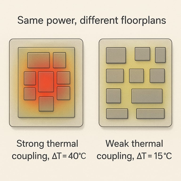Floorplan affects thermal coupling, altering junction temperatures and peak-to-peak temperature differences.