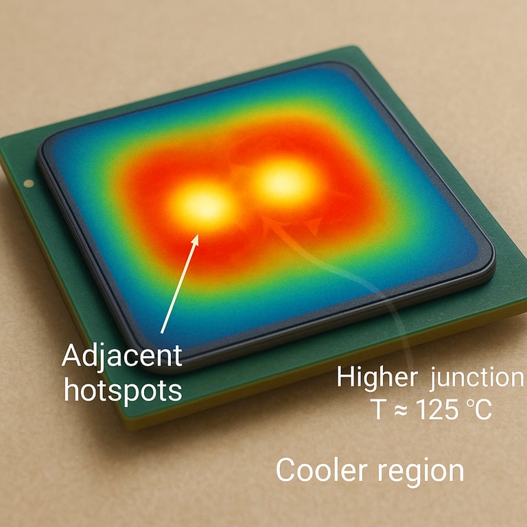 Adjacent hotspots increase junction temperature and temperature difference due to enhanced thermal coupling.
