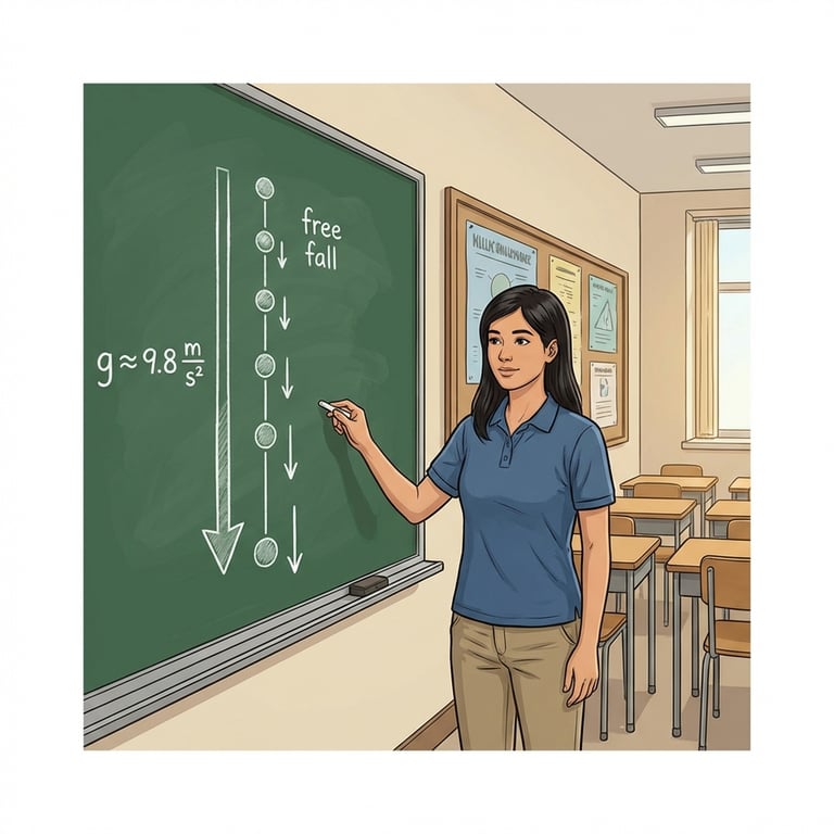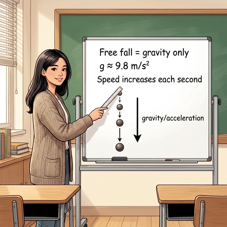 Riya defines free fall as motion under gravity alone, with other forces like air resistance ignored. Even when an object simply drops straight down, she explains, it is speeding up each second, so it must be accelerating. The narrator observes that Riya’s goal is to make “falling” sound like a precise physics condition, not just a casual word.