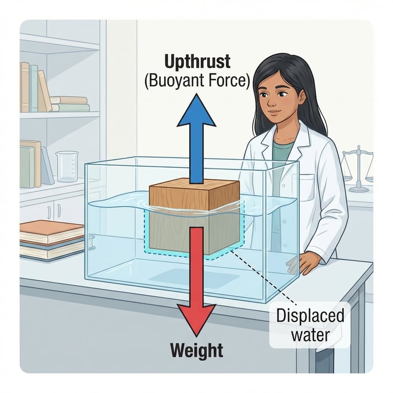 Riya finishes with floating: a fluid pushes upward more strongly at greater depth, producing an upthrust. Whether an object sinks or floats depends on the balance between upthrust and weight, closely tied to density. The narrator follows as she states Archimedes’ principle: the buoyant force equals the weight of fluid displaced, explaining ships, submarines, and hydrometers.