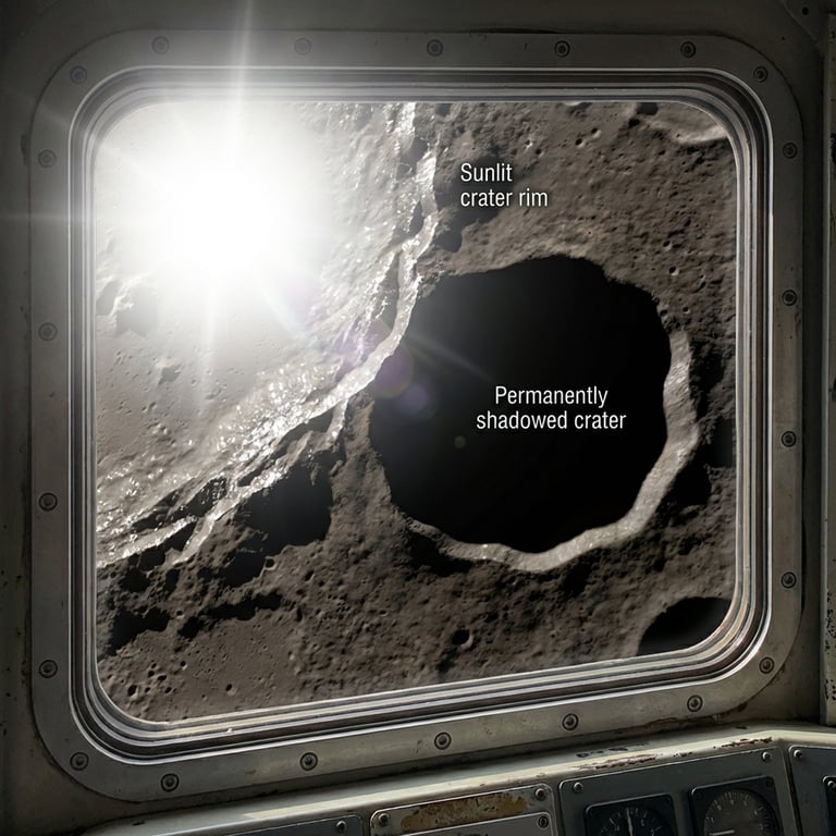 As the orbiter’s path carried him over one crater’s rim, sunlight flared off jagged rock and flooded the window with glare. The contrast was violent: a bright, blistered ridge beside a pit of permanent night. Ethan blinked, awed by how a single step across terrain could leap from furnace to freezer, all on the same small planet.