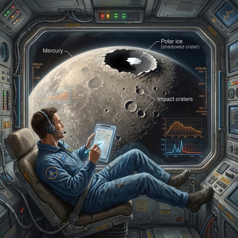 He stared at the endless pits and rings stacking to the horizon and wondered why a planet could look so much like the Moon. From this altitude, every impact basin seemed preserved, sharp-edged and proud, as if time had stopped. Ethan’s curiosity turned the cabin into a classroom, with Mercury itself as the chalkboard.