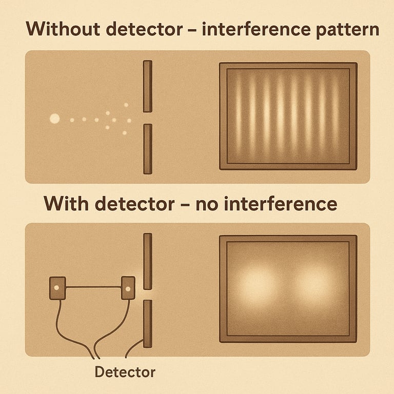 Inserting detectors in experiments eliminates interference patterns, highlighting observer effect in quantum mechanics.
