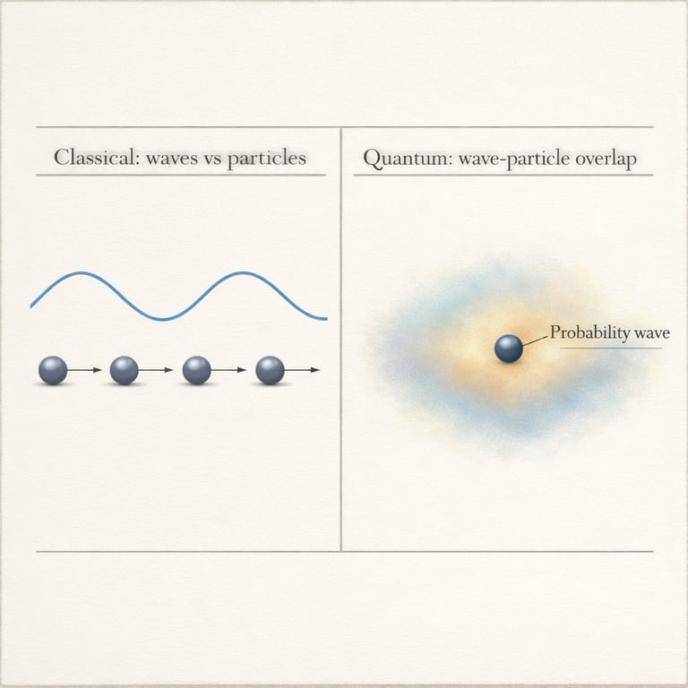 Classical physics separates waves and particles; quantum systems show overlap, with waves obeying probability-based equations.