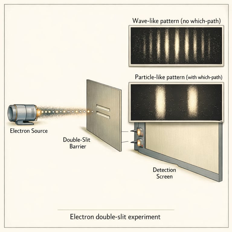 Famous experiment showing electrons form interference pattern when unobserved, displaying wave behavior, but act like particles when observed.