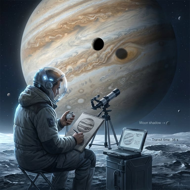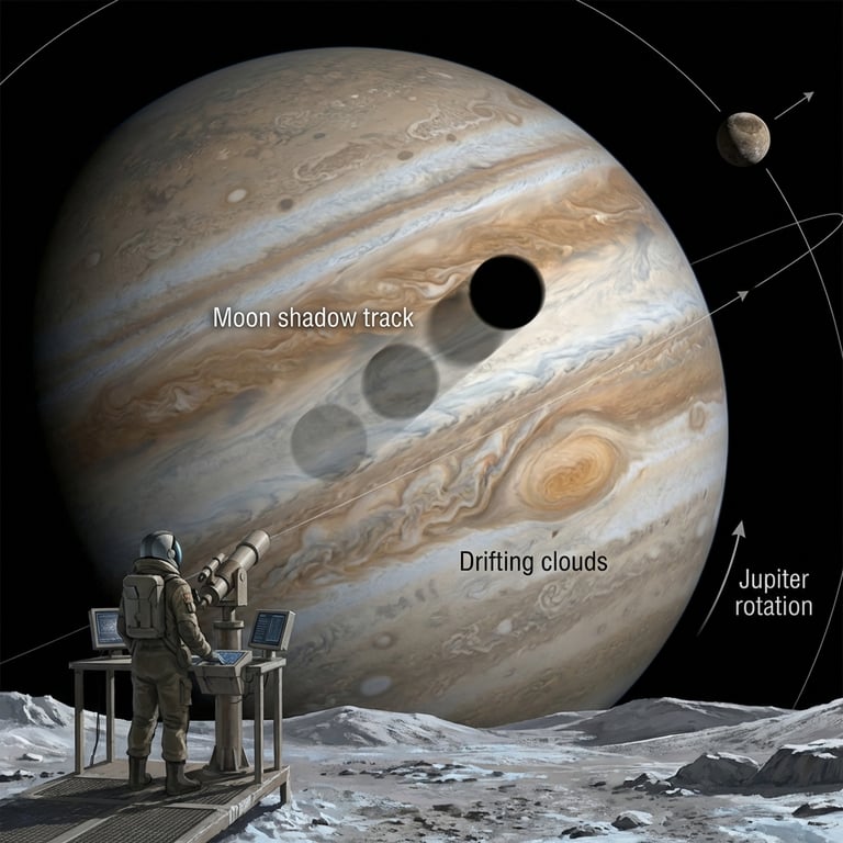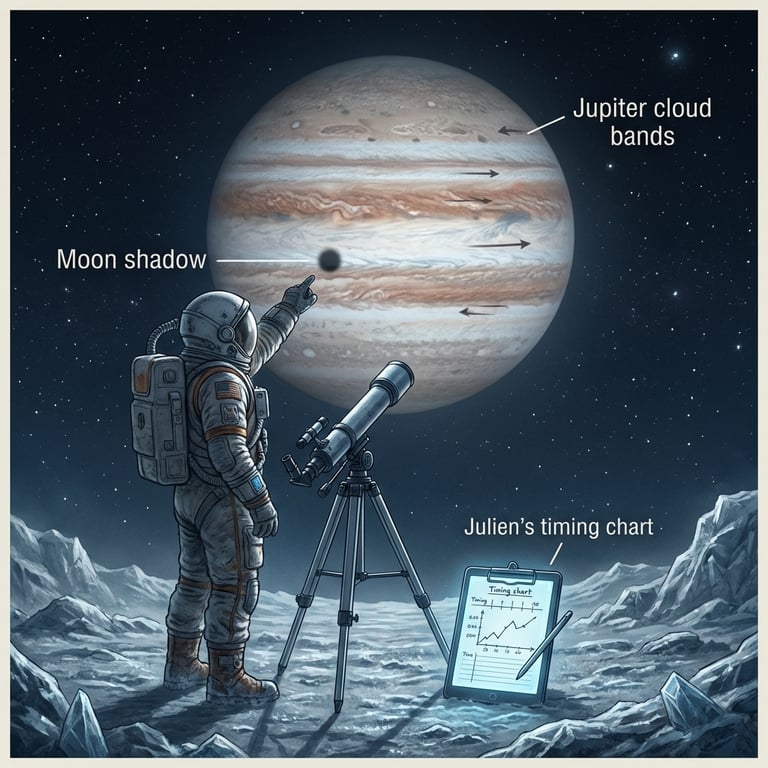 When a moon’s shadow began to crawl across the cloud tops, Julien stopped sketching and started timing. The dark dot was a ruler and a stopwatch at once, its path cutting through bands and spots. He logged each transit, comparing where the shadow fell against familiar storm features, and he felt an old navigator’s thrill: motion could be measured by silhouettes.