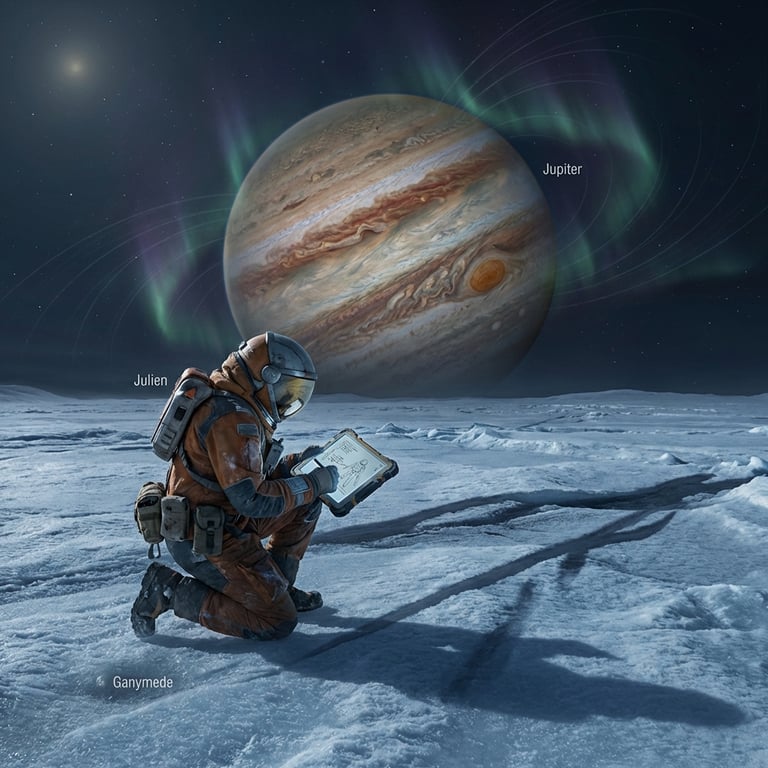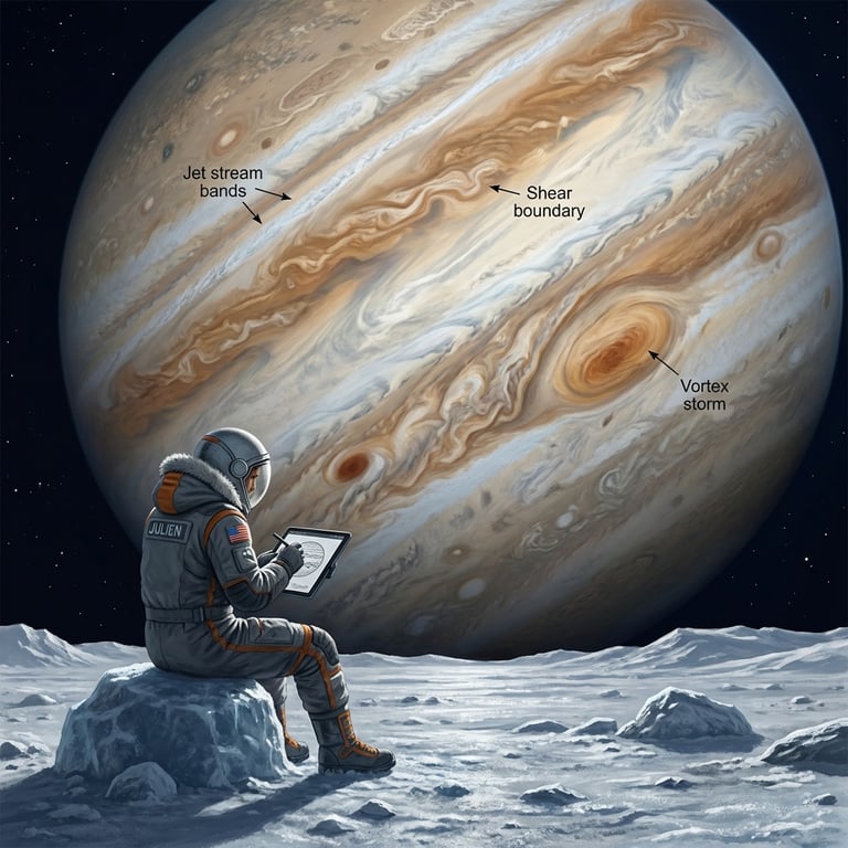 Julien began his shift inside the Ganymede outpost’s dome, where the glass held back hard vacuum and softer fears. He set pencil to tablet and sketched Jupiter’s face—bands like brushed metal, storms like bruises—capturing how the colors subtly re-sorted themselves minute by minute, as if the planet were thinking in weather and exhaling its thoughts into view.