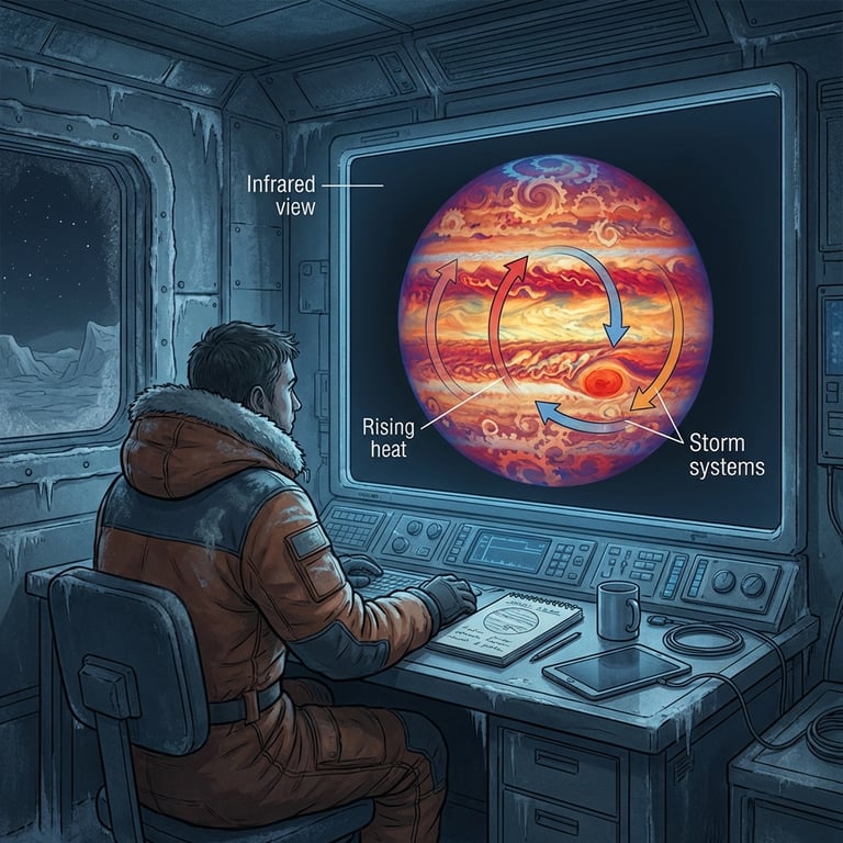 Infrared channels showed something sunlight alone couldn’t explain: warmth rising from deep layers, feeding convection like a furnace under an endless sky. Julien pictured heat climbing, cooling, sinking, and climbing again in loops that never touched land, turning the atmosphere into a rolling engine. The storms were not scars on a crust, but the visible gears of that engine.