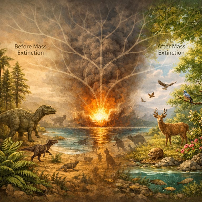Darwin's natural selection theory details survival advantages. Earth’s five major mass extinctions reshaped life significantly.