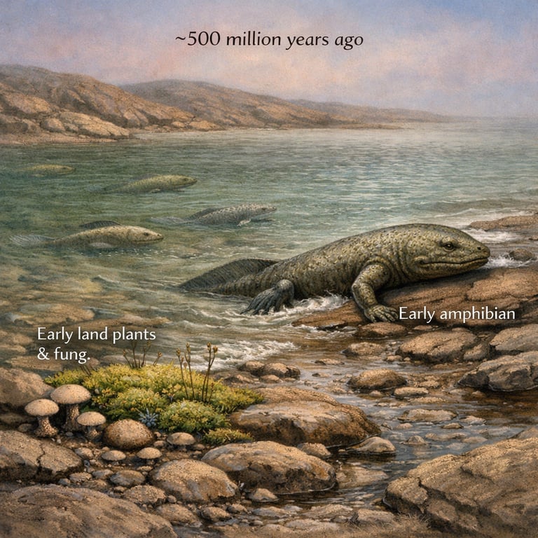 Around 500 million years ago, life extended to land with plants and fungi adapting, followed by animals such as early amphibians.
