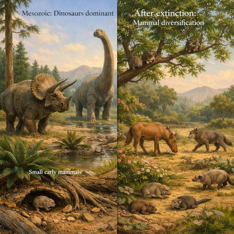 Dinosaurs ruled the Mesozoic era, while small mammals coexisted with them, later diversifying after the Cretaceous extinction event.