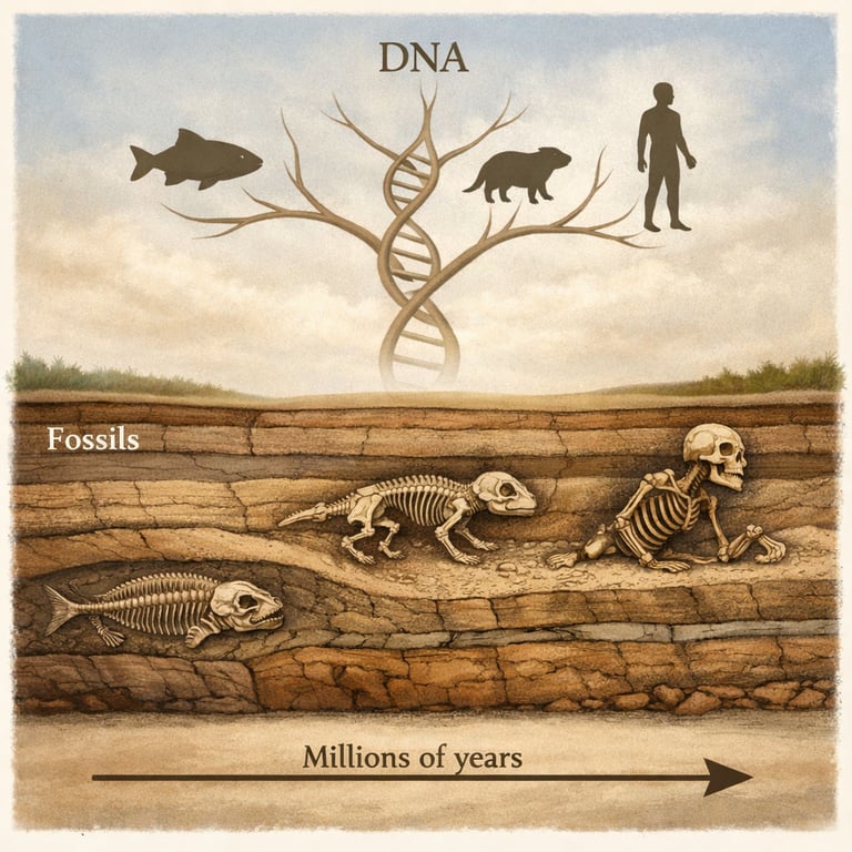 Fossils and genetic data offer insights into evolution, displaying chronological and relational development over millions of years.