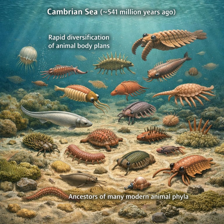 Approximately 541 million years ago, the Cambrian Explosion led to rapid life diversification, introducing most major animal phyla.