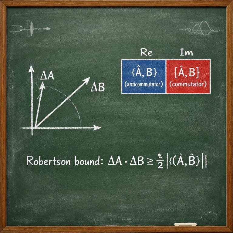 Using Cauchy–Schwarz inequality on centered operators \( \Delta\hat{A}, \Delta\hat{B} \), derive Robertson bound. Explain decomposition of inner product into commutator and anticommutator.