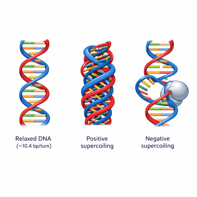 DNA can be over- or under-wound relative to its relaxed twist (about one turn per 10.4 bp). Positive supercoiling tightens winding and stabilizes pairing; negative supercoiling loosens winding and helps strand separation. Cells commonly maintain slight negative supercoiling using topoisomerases, which cut and reseal DNA to manage torsional stress generated during replication and transcription. This mechanical regulation is essential for genome stability and gene expression dynamics.