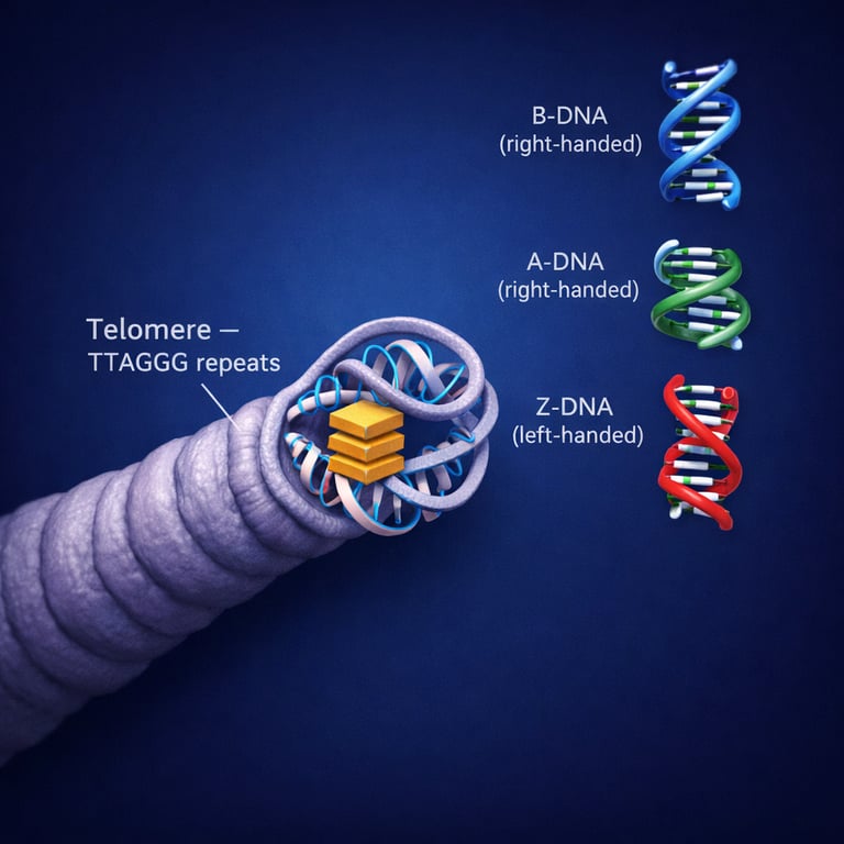 Beyond common B-DNA, DNA can adopt A-DNA (wider, right-handed; favored by dehydration and some DNA–RNA hybrids) and Z-DNA (left-handed; associated with certain sequences and base modifications like methylation). Linear chromosomes end in telomeres, often rich in TTAGGG repeats in humans, which protect ends and solve replication limits via telomerase. Telomeric guanine-rich tracts can form G-quadruplexes (stacked guanine tetrads) and T-loops/D-loops that further stabilize chromosome ends.