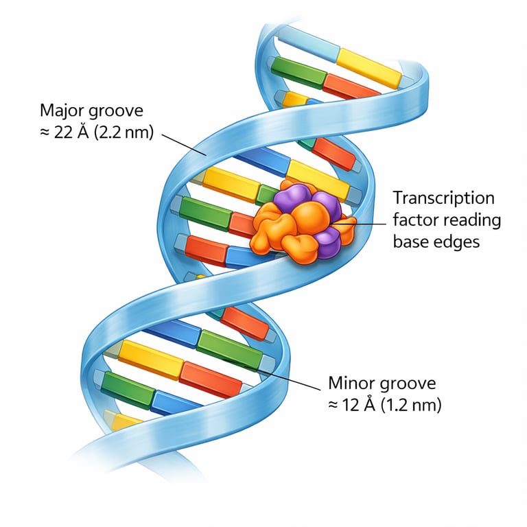 The helix creates major and minor grooves that differ in size because strands are offset. In B-DNA the major groove is ~22 Å (2.2 nm) wide and the minor groove is ~12 Å (1.2 nm). Base edges are more accessible in the major groove, so many sequence-specific DNA-binding proteins (e.g., transcription factors) “read” DNA by contacting functional groups exposed there. Groove geometry thus links structure to gene regulation.
