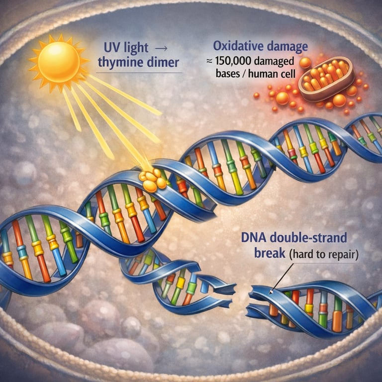 DNA is altered by mutagens such as UV light, X-rays, oxidants, and alkylating agents. UV can form thymine dimers, while oxidative stress can produce base modifications and double-strand breaks, which are among the hardest lesions to repair and can drive mutations and cancer. A quantitative claim in the text is that a typical human cell contains about 150,000 bases that have suffered oxidative damage; unrepaired damage can accumulate with age, linking DNA lesions to aging biology.
