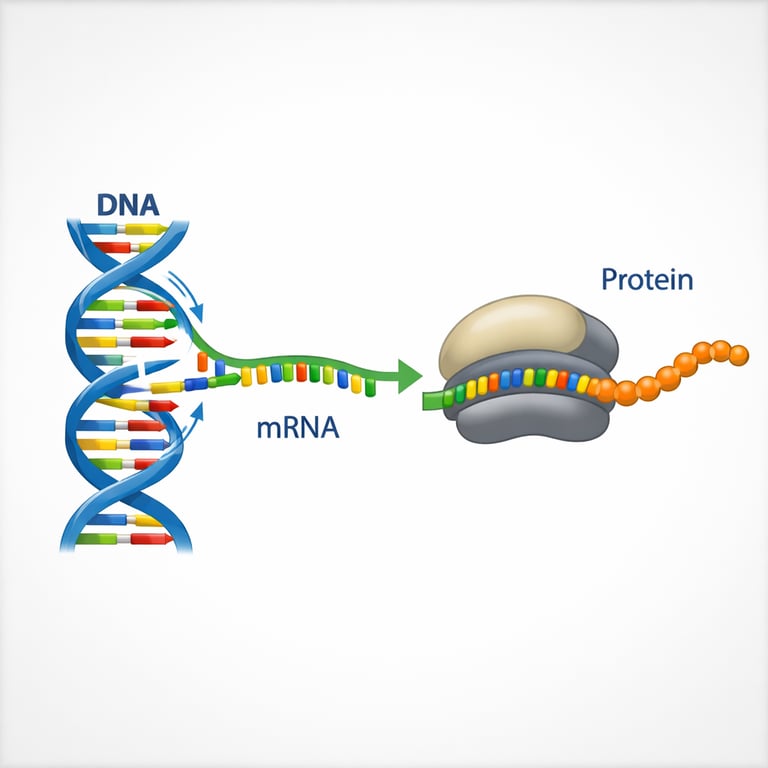 Complementarity enables DNA replication: strands separate and each serves as a template for synthesis by DNA polymerases, which extend only in the 5′→3′ direction, requiring distinct mechanisms for leading and lagging strands. In transcription, DNA templates RNA (with uracil replacing thymine), and in translation, mRNA codons specify amino-acid sequences in proteins. This DNA→RNA→protein relationship is a core organizing principle in molecular biology.