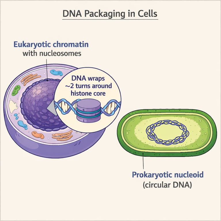 In eukaryotes, DNA is packaged into chromosomes and compacted with chromatin proteins such as histones. Histones form nucleosomes—disk-like cores around which DNA wraps in about two turns—creating an organized, compact structure that influences accessibility to transcription machinery. Prokaryotes store DNA in the cytoplasm, typically as circular chromosomes within a nucleoid region. Packaging helps fit DNA into cellular space and regulates which sequences are transcribed.