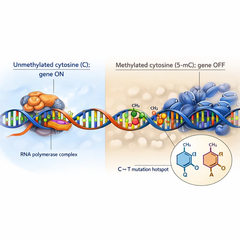 DNA can contain modified (noncanonical) bases, notably 5-methylcytosine, recognized historically in 1925. In bacteria and phages, unusual bases can help evade restriction enzymes. In plants and animals, cytosine and adenine modifications contribute to epigenetic control of gene expression by altering chromatin state and transcriptional accessibility. Cytosine methylation is also implicated in X-chromosome inactivation; methylated cytosines can deaminate to thymine, increasing mutation susceptibility.