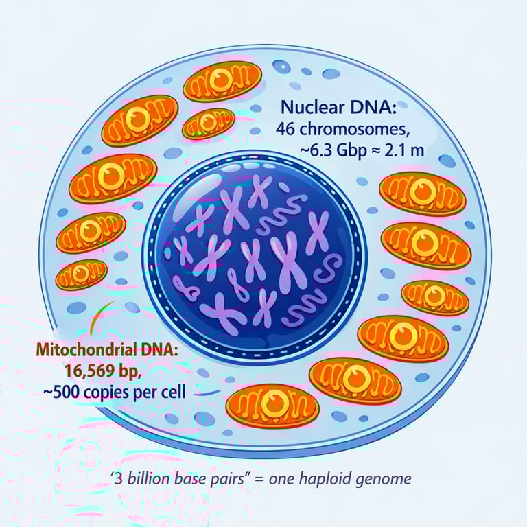 Human nuclear DNA totals ~3.1–3.2 billion base pairs per haploid set (23 chromosomes); somatic cells are diploid with 46 chromosomes and ~6.3–6.4 Gbp, about 2 m of DNA and ~6–7 pg per cell. Mitochondrial DNA is a 16,569 bp circular genome present in hundreds to thousands of copies per cell. DNA stores, copies, and transmits genetic information.