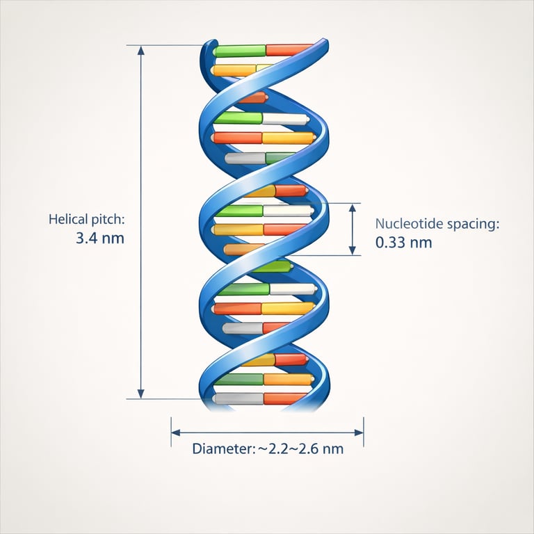 Typical B-form DNA has a helical pitch of 34 Å (3.4 nm) and a radius near 10 Å (1.0 nm). Reported widths can vary by solution conditions, with measurements such as 22–26 Å (2.2–2.6 nm) cited in different buffers. One nucleotide unit is about 3.3 Å (0.33 nm) in length along the helix axis, and the buoyant density of most DNA is about 1.7 g/cm³, reflecting composition and packing.