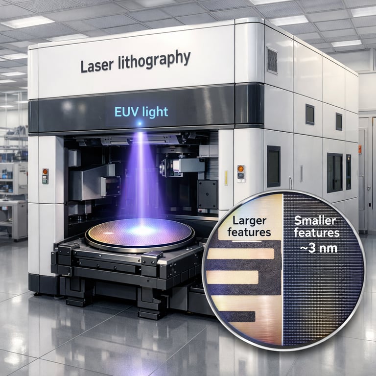 EUV and laser technologies improve resolution for smaller feature sizes in integrated circuits.