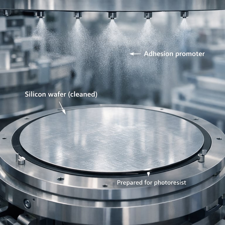 Silicon wafers are cleaned and prepared with an adhesion promoter for photoresist application.