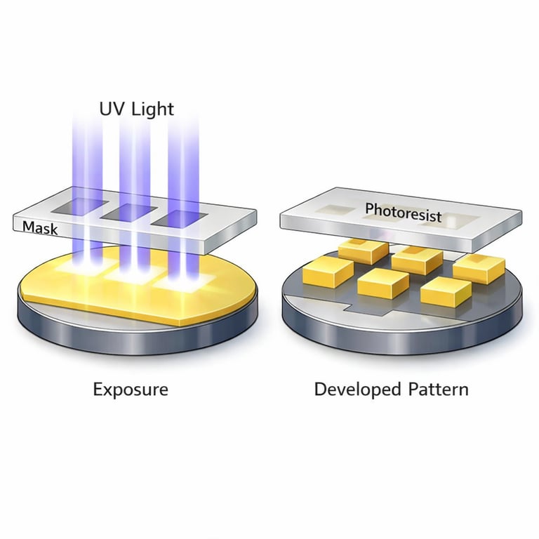 Light exposure changes photoresist properties, allowing development to reveal the pattern.