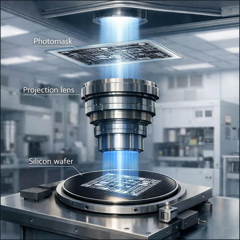 Use of photomasks in projection systems to pattern wafers efficiently in semiconductor fabrication.