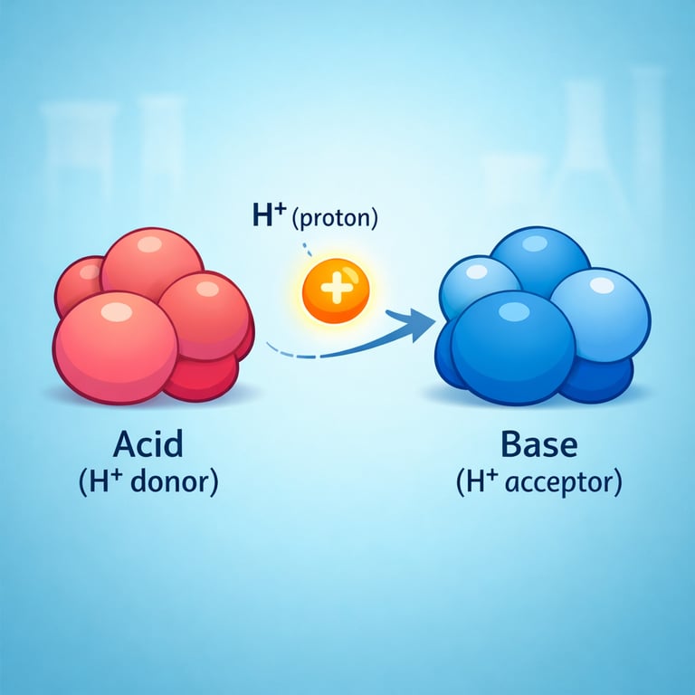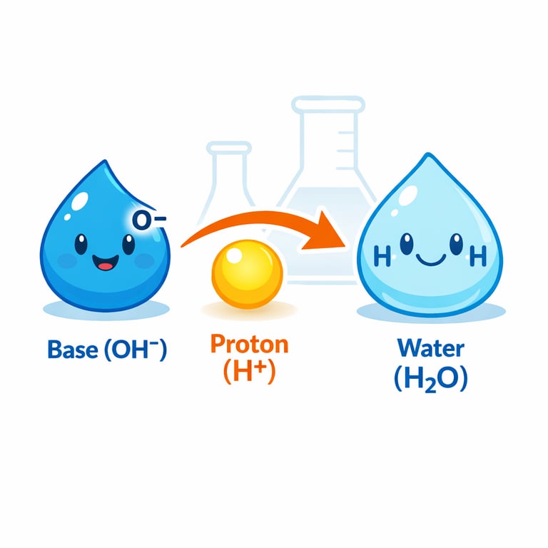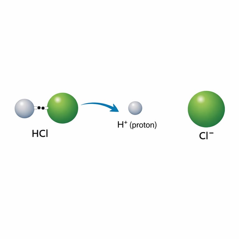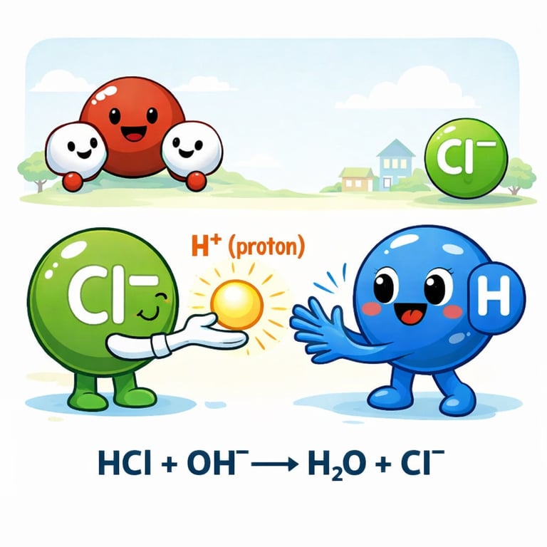 In this story, an acid gives away a proton and a base grabs it. The bond between hydrogen and chlorine breaks, leaving chloride with a negative charge. The proton then attaches to hydroxide, forming a new oxygen–hydrogen bond and turning hydroxide into neutral water. Tracking the moving proton explains the reaction, the charge changes, and which bonds break and form.
