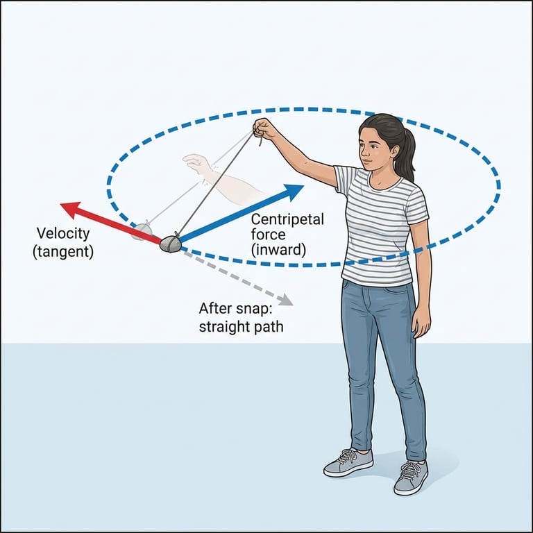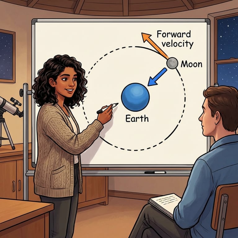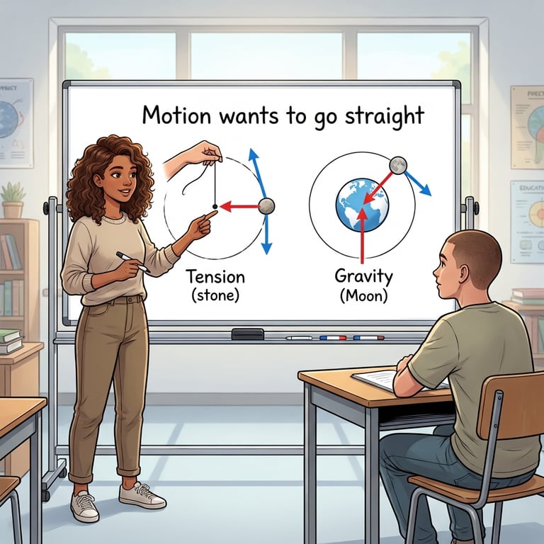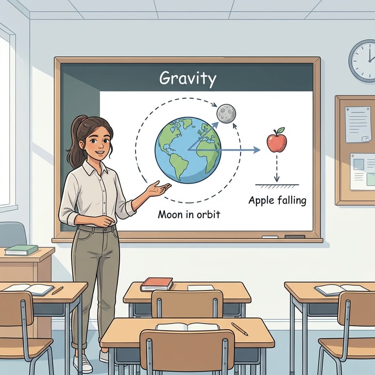 Riya builds a single storyline from Newton’s insight that the same gravity causes falling and keeps the Moon in orbit. She uses a stone-on-thread demo to explain inward force and tangential motion, then introduces how gravity depends on mass and distance. She connects this to free fall near Earth with a reliable gravitational acceleration and kinematics for vertical motion, clarifies mass versus weight with the Moon example, and closes with pressure and buoyancy ideas that explain floating and sinking.