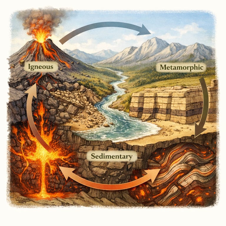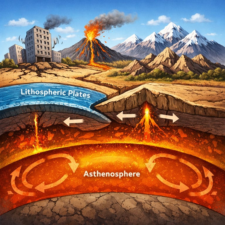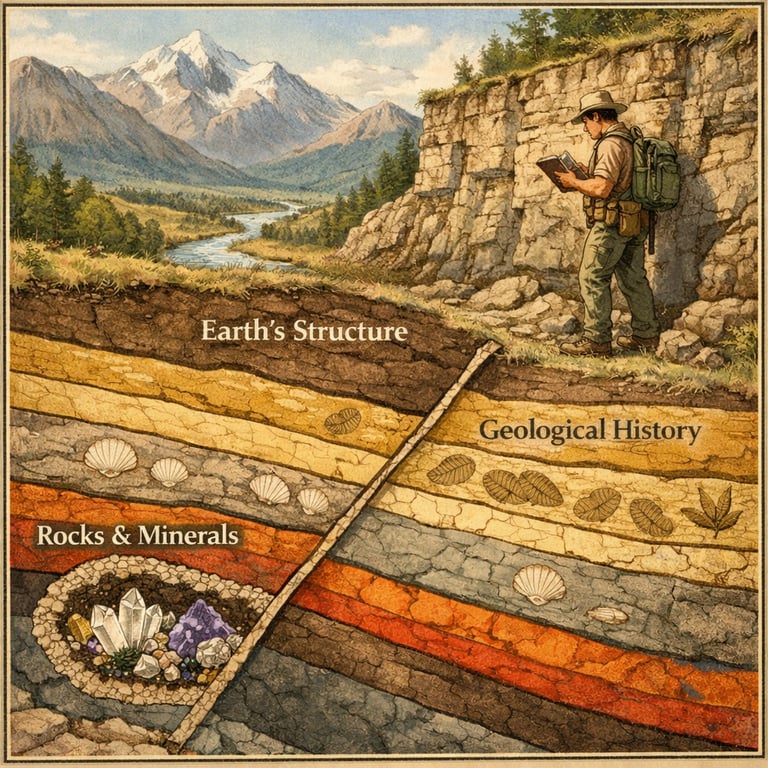 Geology explores Earth's structure, rocks, and processes, highlighting concepts like plate tectonics, mineral identification, and geological history.