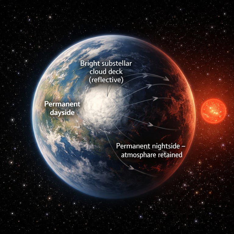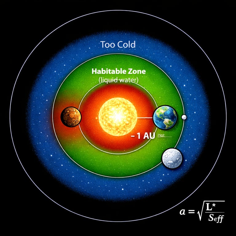 The classical HZ is the range of orbital distances where a rocky planet can maintain long-term surface liquid water given sufficient atmospheric pressure. It depends on stellar luminosity and planetary albedo/greenhouse state. In models it’s approximated by scaling Earth’s insolation: \(a\approx\sqrt{L_\star/S_\mathrm{eff}}\), where \(S_\mathrm{eff}\) is the effective stellar flux for HZ limits.