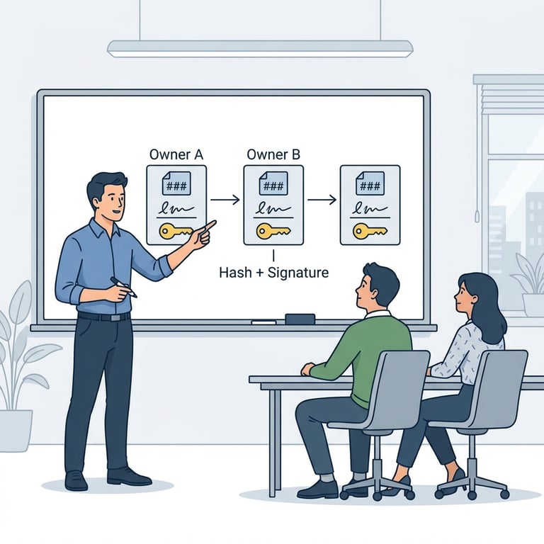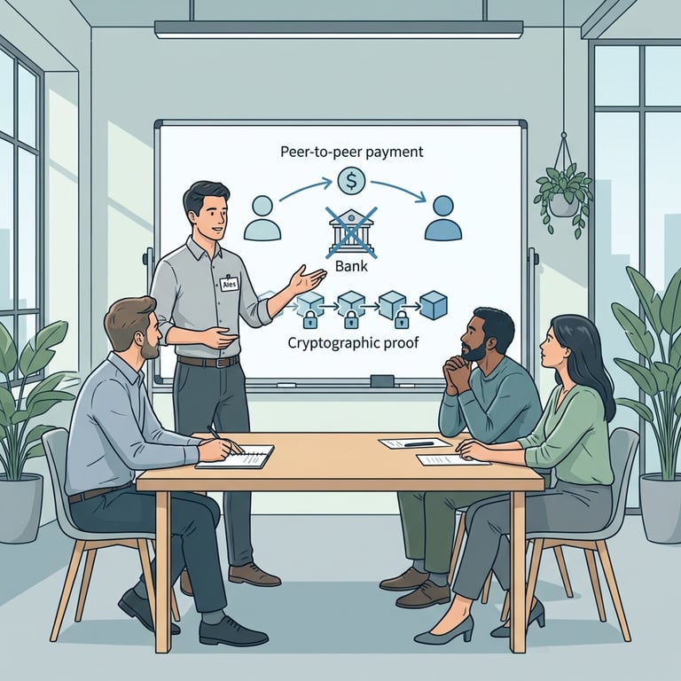 Alex guides his team from the everyday costs of trust-based online payments to a system where cryptographic verification replaces institutional guarantees. He explains signature-based ownership, the double-spend problem, and why public broadcast plus agreement on one timeline is essential. He ends by describing a proof-of-work secured, decentralized ledger that resists history rewrites when honest compute is the majority.