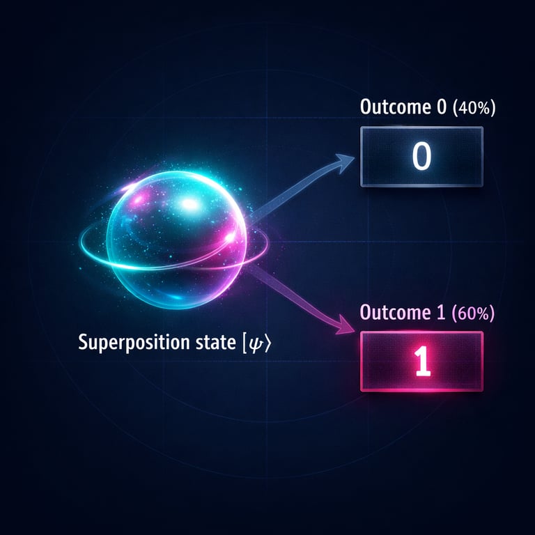 The text explains that classical bits store definite 0/1 values, while qubits can be in a superposition of 0 and 1. Measuring a qubit yields 0 or 1 probabilistically, with predictable probabilities.