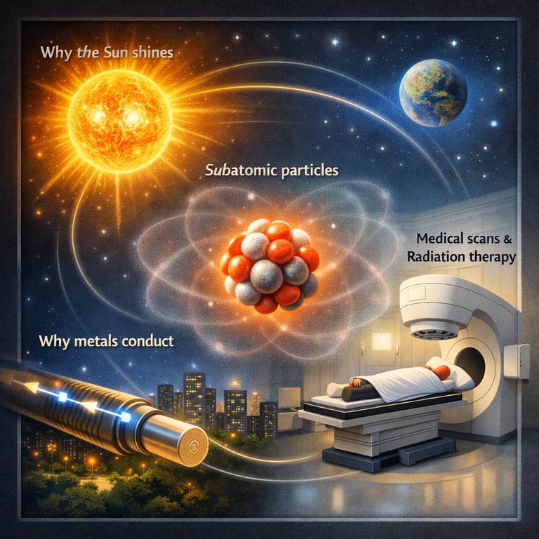Subatomic particles are nature’s smallest known building blocks and the carriers of forces. Quarks combine to form protons and neutrons in the nucleus, while leptons like electrons shape chemistry and electricity. Bosons such as photons transmit forces and energy. Together, these ideas explain light, matter, nuclear stability, and many technologies.