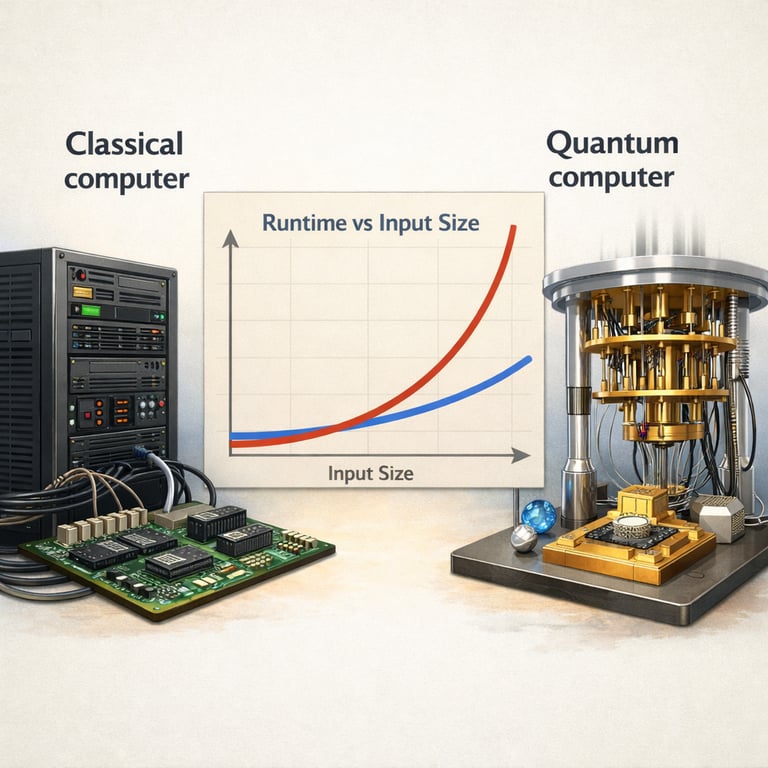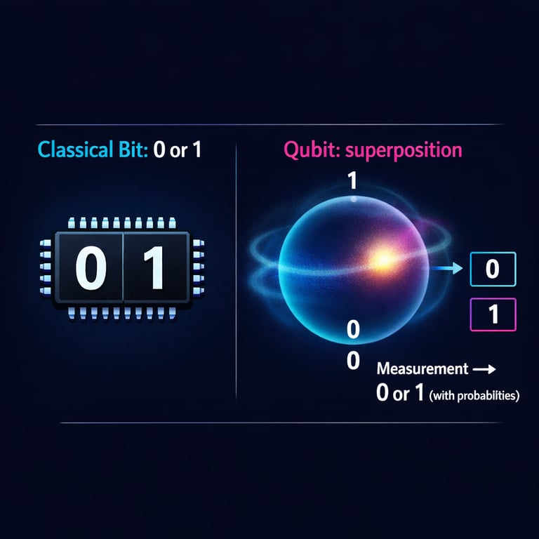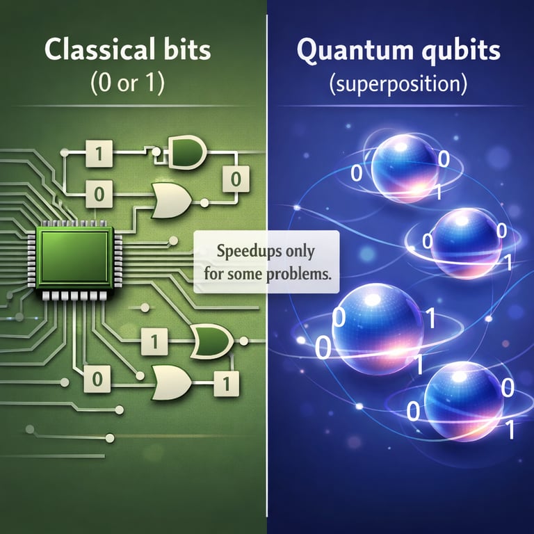 A classical computer stores information as bits that are either 0 or 1, and it processes them with logic gates that deterministically flip or combine bits. A quantum computer stores information as quantum bits (qubits) and processes them with quantum operations that can create and manipulate superpositions and correlations. The big idea is not “faster for everything,” but “different physics,” enabling speedups for certain problems.