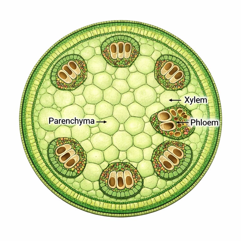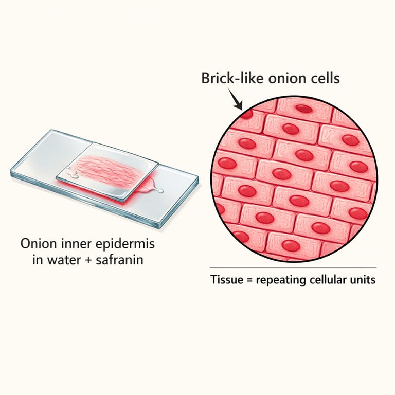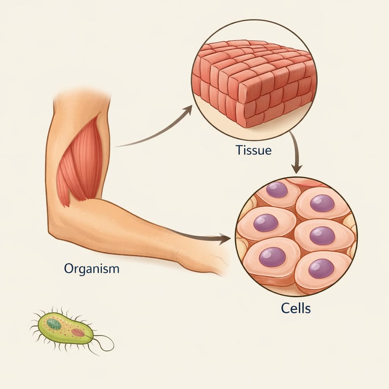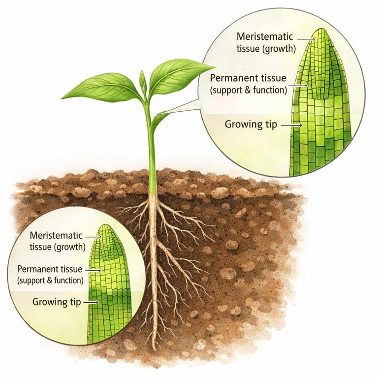 The document explains tissues in plants and animals, detailing their types and functions. It covers plant tissues like meristematic and permanent tissues, and animal tissues such as epithelial, connective, muscular, and nervous tissues.