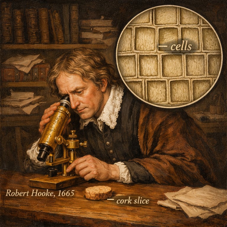 In 1665, Robert Hooke observed a thin slice of cork under a self-designed microscope and noticed honeycomb-like compartments, which he named “cells.” The term comes from the Latin word for “a little room,” and this observation was pivotal because it was the first evidence that living things are composed of discrete units, a concept still central to biology today.