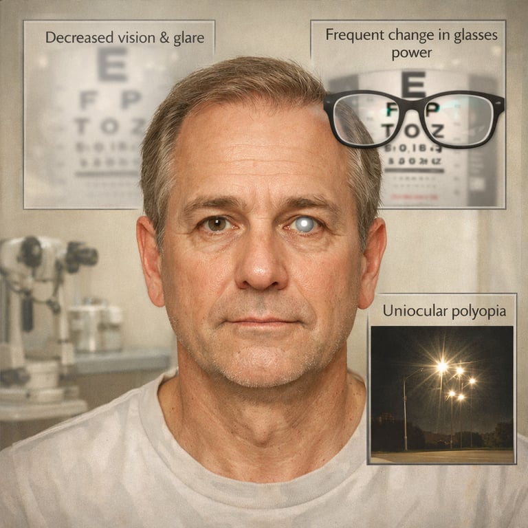 This document outlines the standard treatment workflow for cataract management, including diagnosis, surgical indications, necessary examinations, and post-operative care.