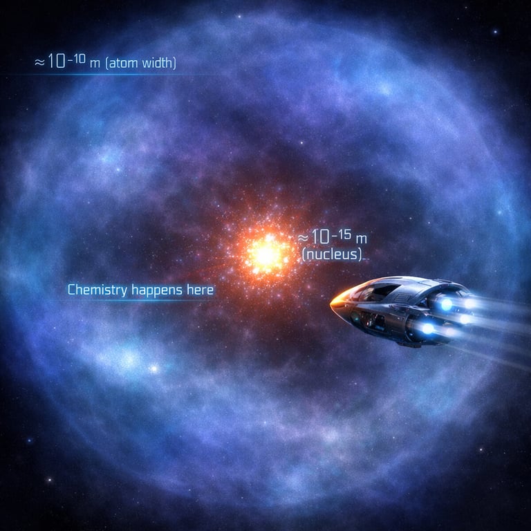 Mission Log 01: The crew shrinks to an atom, about \(10^{-10}\,\text{m}\) wide. It’s mostly empty space: a dense nucleus near \(10^{-15}\,\text{m}\) and a fuzzy electron cloud where location is probability, not tiny planets. The navigator marks the first “zoom click” and notes: chemistry lives out here, not in the core.