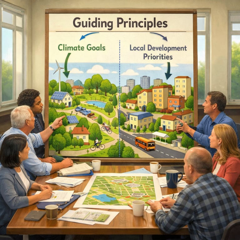 The document outlines guiding principles for city climate action planning, focusing on reducing emissions, enhancing resilience, and integrating climate objectives into urban policies.